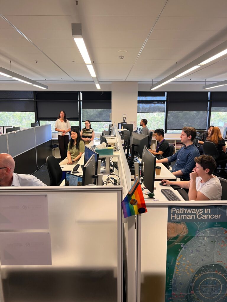 Dan walked through the office corridor on level 4, adorned with framed MHF Beanies representing each year since the Centre’s establishment, before meeting MHF Centre staff and researchers from our Imaging, Experimental Therapeutics and Translational Neuroscience Teams.