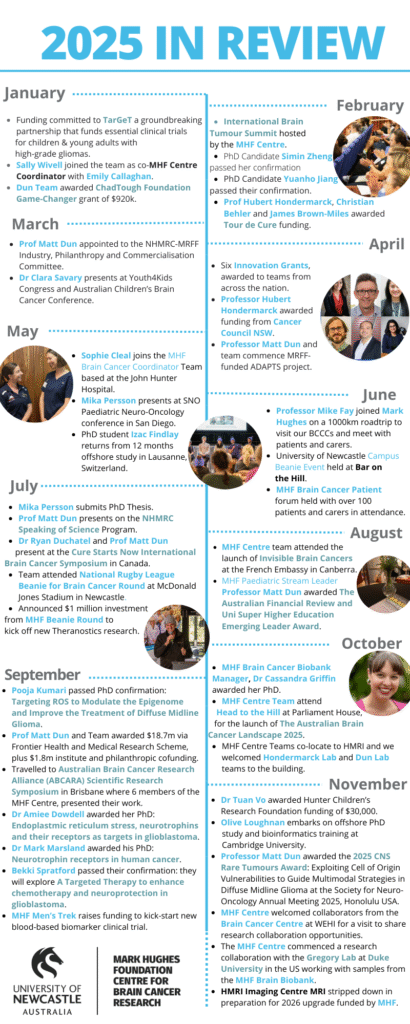 From early-career researchers like PhD candidate Bekki Spratford progressing their work, to new voices for cancer neuroscience led by Professor Hubert Hondermarck, the year reinforced one clear message: progress happens when we work together.